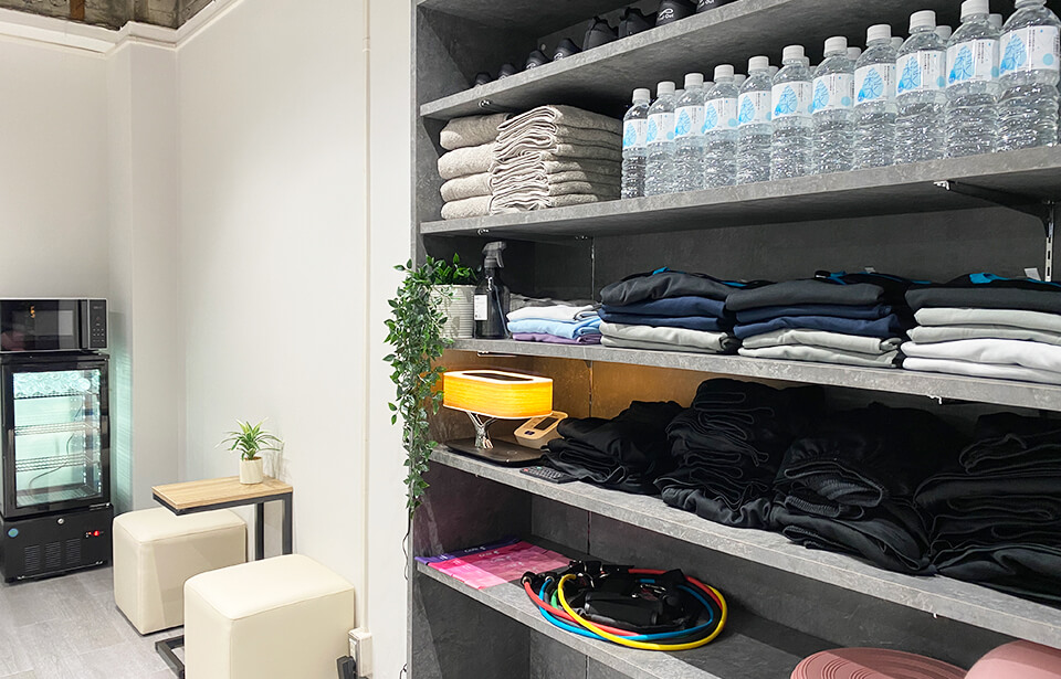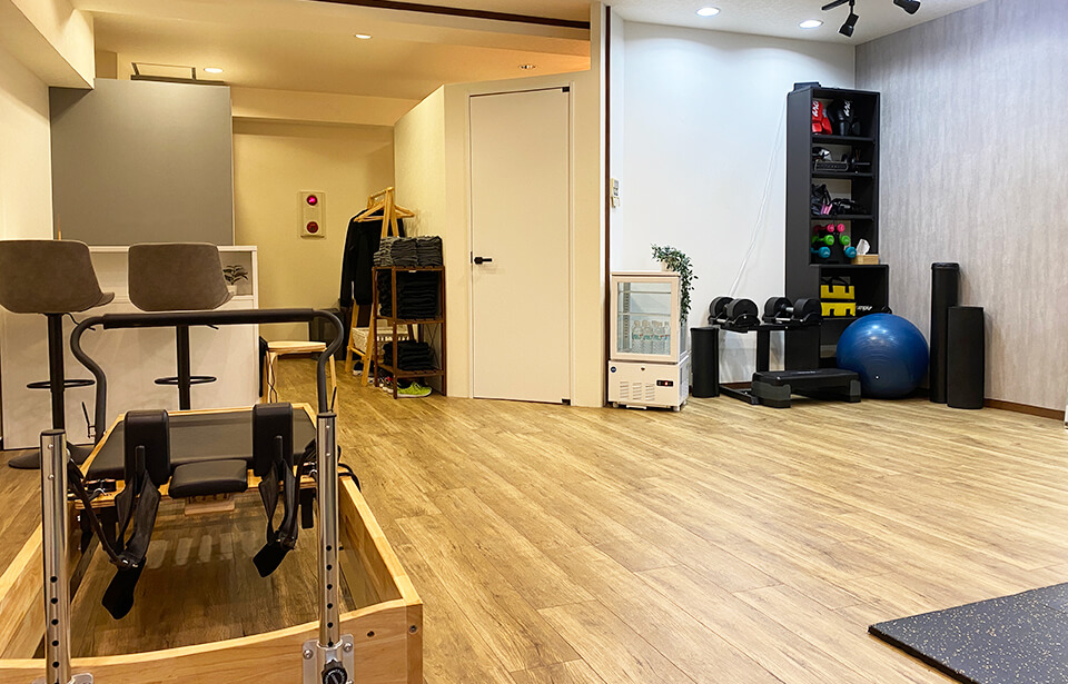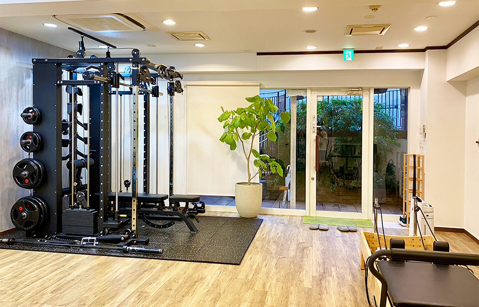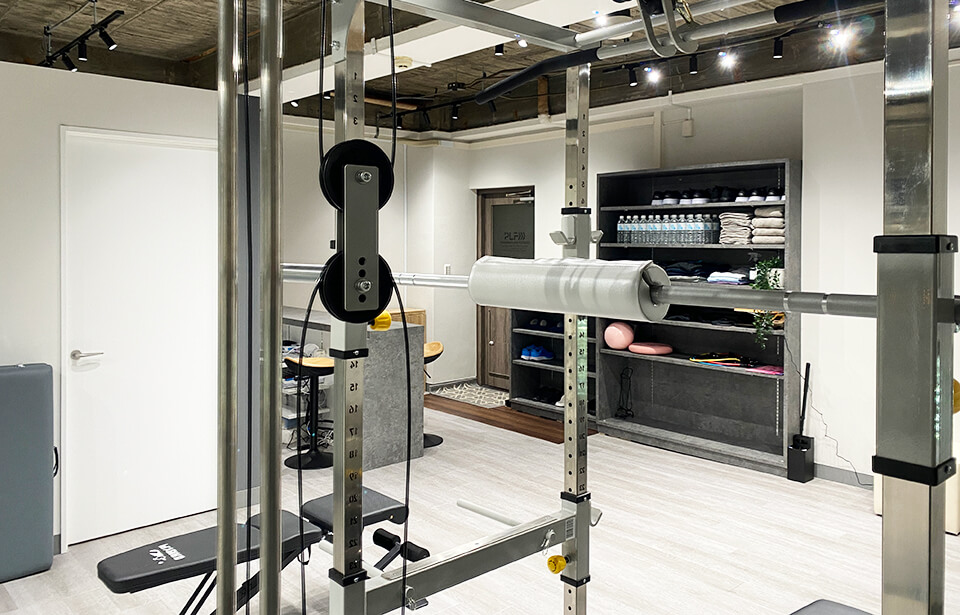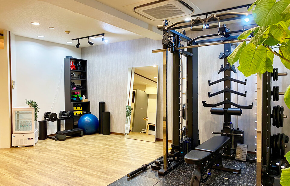 パワーラック(ラットオプション付)、プレート(1.25〜20kg×2)、可変式ダンベル(MAX22kgペア)、ダンベル(1〜3kgペア)、アジャスタブルベンチ、EZバー、バランスボール、ストレッチマット×2、ソフトギムニクボール、バランスディスク、ステップ台、ストレッチポール×1、グリッドローラー×1、施術ベッド、エクササイズバンド、フレックスクッション、血圧計、体組成計、空気清浄機